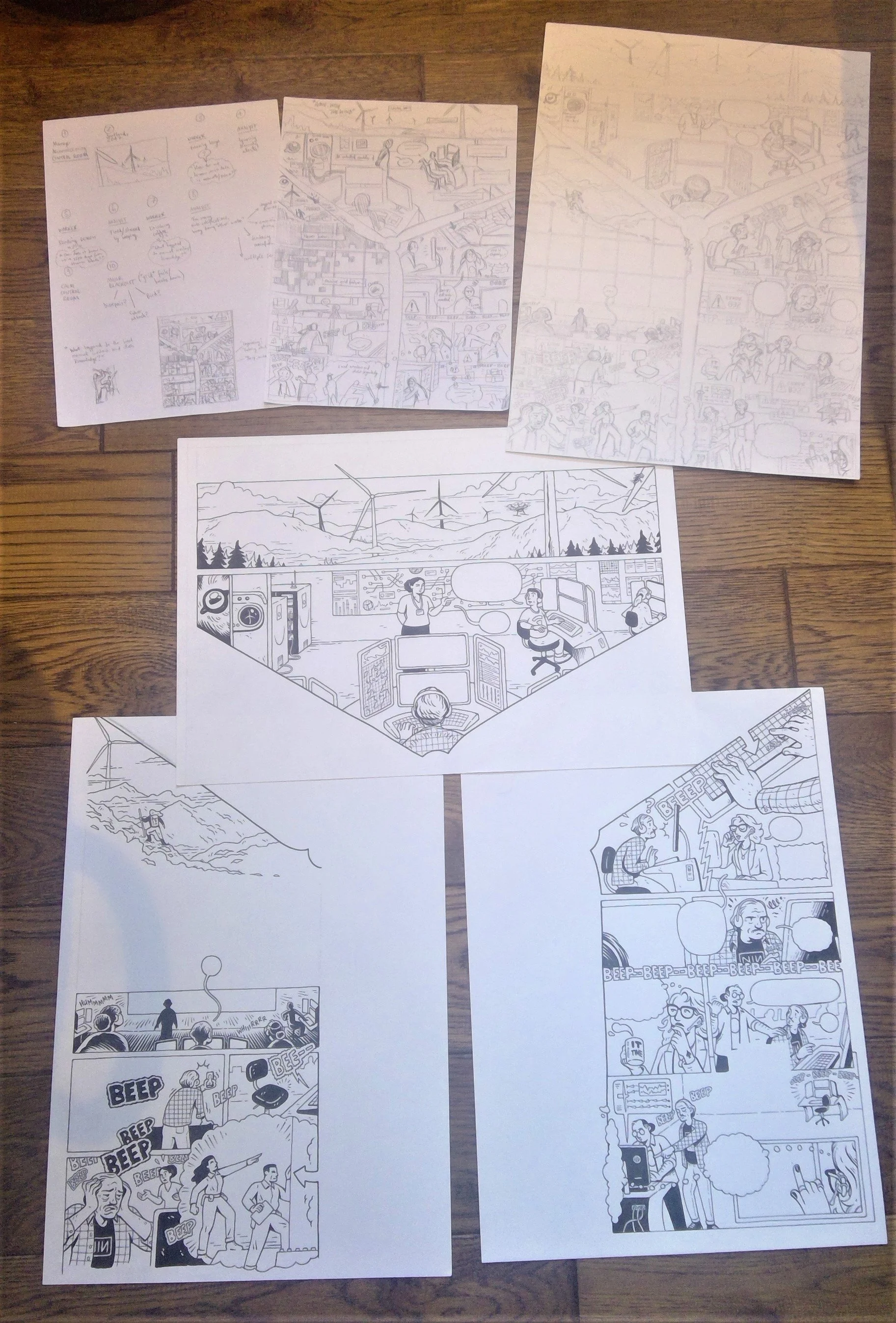A large-format “circular” comic created in collaboration with the Power2 project as part of a series of artistic responses to their research exploring the intersection of digital energy, technology, and human emotions. This piece “Gone With the Wind” considers the digitalisation of the renewable energy industry form the point of view of those delivering and maintaining the infrastructure.
